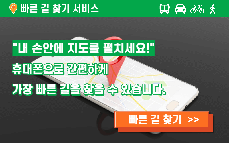 네이버, 다음의 빠른길 찾기 서비스를 안내합니다. 휴대폰만 있다면 빠른길 찾기 서비스를 통해 가장 짧은 시간에 목적지에 도착할 수 있습니다. 자세한 사항은 위의 버튼을 클릭 후 이용하시기 바랍니다. 감사합니다.